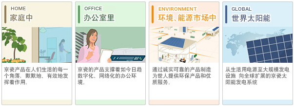 家庭、辦公室、社區(qū)乃至世界各地,京瓷的產(chǎn)品已成為我們生活中不可或缺的一部分.例如,將太陽(yáng)光轉(zhuǎn)換成清潔能源的住宅用太陽(yáng)能發(fā)電系統(tǒng);用于打印機(jī)、復(fù)印機(jī)、電腦等辦公室里各種通信設(shè)備相關(guān)業(yè)務(wù)的電子零部件;豐富社區(qū)溝通的京瓷通信設(shè)備相關(guān)業(yè)務(wù)等,尤其,京瓷新開發(fā)的能源管理系統(tǒng)可以有效控制電耗.從無(wú)電地區(qū)到大型太陽(yáng)能發(fā)電站,京瓷的太陽(yáng)能發(fā)電系統(tǒng)產(chǎn)生的清潔能源發(fā)揮著積極重要的作用.京瓷將通過(guò)各種高品質(zhì)產(chǎn)品,為提高人們的生活水平做出貢獻(xiàn).