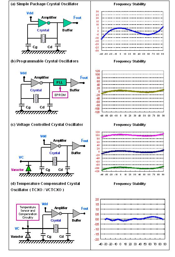 在(圖)提供了數(shù)種石英振蕩器輸出頻率對溫度變化的穩(wěn)定性示義圖