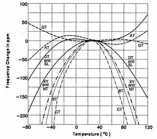 大部份的石英晶體產(chǎn)品是用于電子線路上的參考頻率基準(zhǔn)或頻率控制組件, 所以, 頻率與工作環(huán)境溫度的特性是一個(gè)很重要的參數(shù). 事實(shí)上, 良好的頻率與溫度(frequeny versus temperature)特性也是選用石英做為頻率組件的主要因素之一. 經(jīng)由適當(dāng)?shù)亩x及設(shè)計(jì), 石英晶體組件可以很容易的就滿足到以百萬(wàn)分之一 (parts per million, ppm) 單位等級(jí)的頻率誤差范圍. 若以離散電路方式將LCR零件組成高頻振蕩線路, 雖然也可以在小量生產(chǎn)規(guī)模達(dá)到所需要的參考頻率信號(hào)誤差在ppm或sub-ppm等級(jí)要求, 可是這種方式無(wú)法滿足產(chǎn)業(yè)要達(dá)到的量產(chǎn)規(guī)模. 石英組件的頻率對(duì)溫度特性更是離散振蕩線路無(wú)法簡(jiǎn)易達(dá)成的. 在(圖四) 中提供了數(shù)種不同的石英晶體切割角度的頻率對(duì)溫度特性曲線.