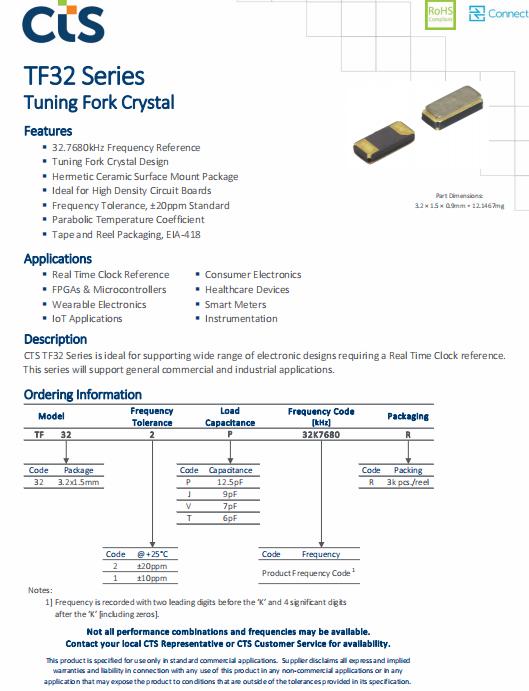 | TF322J32K7680R | CTS晶振 | TF32 | 32.768kHz | 0.126" L x 0.059" W (3.20mm x 1.50mm) |