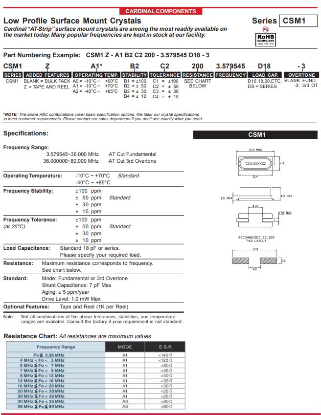 | CSM1Z-A0B2C3-50-18.432D18 | Cardinal晶振 | CSM1 | 18.432MHz | ±50ppm | 50 Ohm | -10°C ~ 60°C |