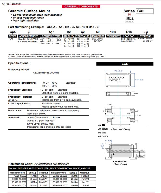 | CX5Z-A2B2C5-40-48D18 | Cardinal晶振 | CX5 | 48MHz | 40 Ohm | -40°C ~ 85°C |