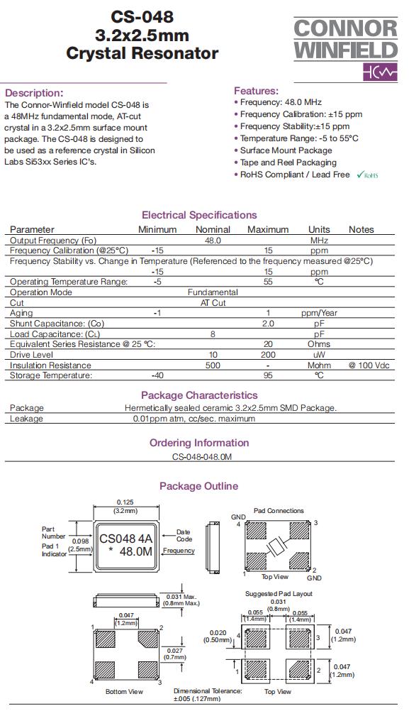 | CS-043-048.0M | Connor-Winfield | CS-043 | 48MHz | ±25ppm | ±15ppm | 8pF | 20 Ohm | -40°C ~ 85°C |