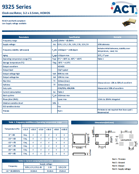 ACT晶振,9325晶振,SPXO振蕩器.3225mm體積非常小的SMDcrystal器件,是民用小型無線數(shù)碼產(chǎn)品的最佳選擇,小體積的晶振被廣泛應(yīng)用到,手機(jī)藍(lán)牙,GPS定位系統(tǒng),無線通訊集,高精度和高頻率的穩(wěn)定性能,非常好的減少電磁干擾的影響,是民用無線數(shù)碼產(chǎn)品最好的選擇,符合RoHS/無鉛.