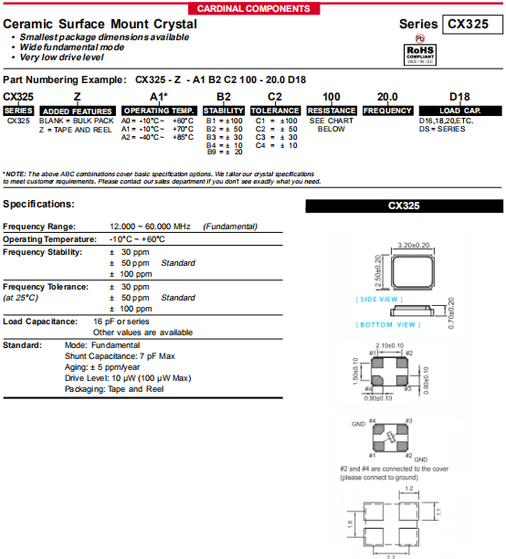 Cardinal晶振,CX325晶振,壓電石英晶體.小型貼片石英晶振,外觀尺寸具有薄型表面貼片型石英晶體諧振器,特別適用于有小型化要求的市場領域,比如智能手機,無線藍牙,平板電腦等電子數(shù)碼產(chǎn)品.晶振本身超小型,薄型,重量輕,晶體具有優(yōu)良的耐環(huán)境特性,如耐熱性,耐沖擊性,在辦公自動化,家電相關電器領域及Bluetooth,Wireless LAN等短距離無線通信領域可發(fā)揮優(yōu)良的電氣特性,滿足無鉛焊接的回流溫度曲線要求.