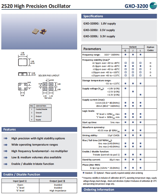 Golledge晶振,GXO-3200晶振,進口水晶振蕩子.小型貼片有源晶振,體積的變小也使產(chǎn)品帶來了更高的穩(wěn)定性能,接縫密封石英晶體振蕩器,精度高,覆蓋頻率范圍寬的特點,貼片高速自動安裝和高溫回流焊設(shè)計,Optionable待機輸出三態(tài)輸出功能,電源電壓范圍:1.8V?5V,高穩(wěn)定性,低抖動,低功耗,主要應(yīng)用領(lǐng)域:無線通訊,智能手機,平板筆記本W(wǎng)LAN,藍牙,數(shù)碼相機,DSL和各式IT產(chǎn)品的晶振應(yīng)用,三態(tài)功能,PC和LCDM等數(shù)碼領(lǐng)域,符合RoHS/無鉛.