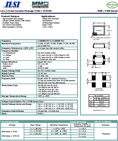 ILSI晶振,I789晶振,壓控溫補(bǔ)晶體振蕩器.智能手機(jī)晶振,產(chǎn)品具有高精度超小型的表面貼片型石英晶體振蕩器,最適用于移動(dòng)通信終端的基準(zhǔn)時(shí)鐘等移動(dòng)通信領(lǐng)域.比如智能手機(jī),無線通信,衛(wèi)星導(dǎo)航,平臺(tái)基站等較高端的數(shù)碼產(chǎn)品,晶振本身小型,薄型具備各類移動(dòng)通信的基準(zhǔn)時(shí)鐘源用頻率,貼片晶振具有優(yōu)良的電氣特性,耐環(huán)境性能適用于移動(dòng)通信領(lǐng)域,滿足無鉛焊接的高溫回流溫度曲線要求.