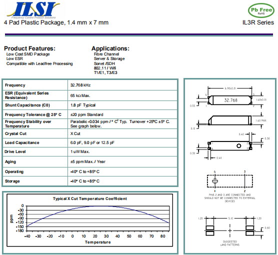 ILSI晶振,IL3R晶振,7015石英晶體諧振器.32.768K時(shí)鐘晶體具有小型,薄型,輕型的貼片晶振表面音叉型晶體諧振器,產(chǎn)品具有優(yōu)良的耐熱性,耐環(huán)境特性,可發(fā)揮晶振優(yōu)良的電氣特性,符合RoHS規(guī)定,滿足無鉛焊接的高溫回流溫度曲線要求,金屬外殼的封裝使得產(chǎn)品在封裝時(shí)能發(fā)揮比陶瓷諧振器外殼更好的耐沖擊性.