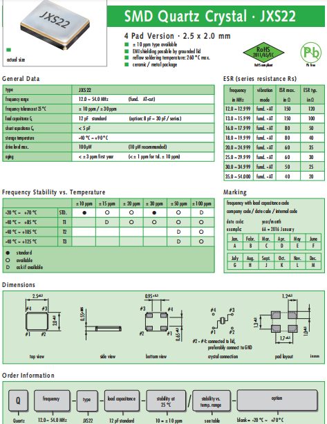 JAUCH晶振,JXS22晶振,高性能貼片晶振.小型表面貼片晶振型,是標(biāo)準(zhǔn)的石英晶體諧振器,適用于寬溫范圍的電子數(shù)碼產(chǎn)品,家電電器及MP3,MP4,播放器,單片機(jī)等領(lǐng)域.可對(duì)應(yīng)12.000MHz以上的頻率,在電子數(shù)碼產(chǎn)品,以及家電相關(guān)電器領(lǐng)域里面發(fā)揮優(yōu)良的電氣特性,滿足無(wú)鉛焊接的回流溫度曲線要求.