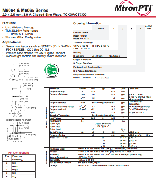 MTRONPTI晶振,M6064晶振,進口溫補晶振.小體積貼片2520mm晶振,外觀小型,表面貼片型晶體諧振器,因本身體積小等優勢,適用于移動通信終端的基準時鐘等移動通信領域.小型,薄型,輕型 (2.5 × 2.0 × 0.9 mm typ.) 具備優良的耐環境特性及高耐熱性強.滿足無鉛焊接的回流溫度曲線要求.