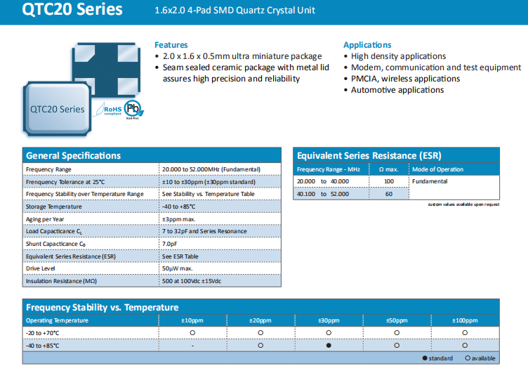 Quarztechnik晶振,QTC20晶振,進口無源晶振.普通石英晶振,外觀完全使用金屬材料封裝的,產品本身采用全自動石英晶體檢測儀,以及跌落,漏氣等苛刻實驗.產品本身具有高穩定性,高可靠性的石英晶體諧振器,焊接方面支持表面貼裝,外觀采用金屬封裝,具有充分的密封性能,晶振本身能確保其高可靠性,采用編帶包裝,可對應產品應用到自動貼片機告訴安裝,滿足無鉛焊接的高溫回流溫度曲線要求.