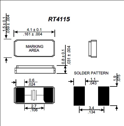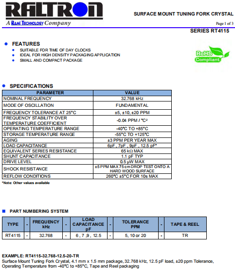 Raltron晶振,RT4115晶振,高品質石英晶體.小體積SMD時鐘晶體諧振器,是貼片音叉晶體,千赫頻率元件,應用于時鐘模塊,智能手機,全球定位系統(tǒng),因產品本身體積小,SMD編帶型,可應用于高性能自動貼片焊接,被廣泛應用到各種小巧的便攜式消費電子數(shù)碼時間產品,環(huán)保性能符合ROHS/無鉛標準.
