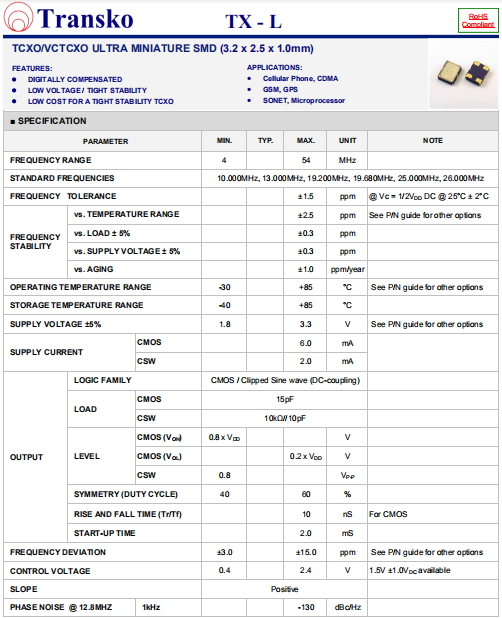 Transko晶振,TX-L晶振,VC-TCXO振蕩器.具有最適合于移動(dòng)通信設(shè)備用途的高穩(wěn)定的頻率溫度特性.為對(duì)應(yīng)低電源電壓的產(chǎn)品.(可對(duì)應(yīng)DC +1.8 V±0.1 V to +3.2 V±0.1 V )高度:最高1.0 mm,體積:0.007 cm3,重量:0.024g,超小型,輕型.低消耗電流,表面貼片型產(chǎn)品.(可對(duì)應(yīng)回流焊) 無(wú)鉛產(chǎn)品.滿(mǎn)足無(wú)鉛焊接的回流溫度曲線要求.