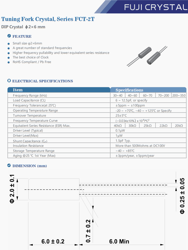 | FCT2T03276806Y1 | Fuji晶振 | FCT-2T | 32.768 kHz | 6pF | -40°C ~ 85°C |
