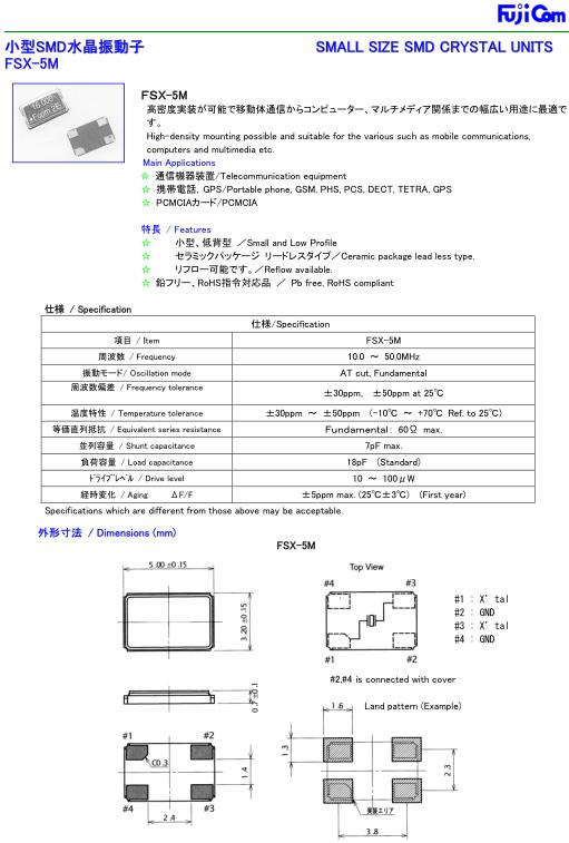 日本富士晶振,FSX-5M高質(zhì)量晶振,5032mm四腳貼片晶振,智能手機晶振,產(chǎn)品具有高精度超小型的表面貼片型石英晶體振蕩器,最適用于移動通信終端的基準(zhǔn)時鐘等移動通信領(lǐng)域.比如智能手機,無線通信,衛(wèi)星導(dǎo)航,平臺基站等較高端的數(shù)碼產(chǎn)品,晶振本身小型,薄型具備各類移動通信的基準(zhǔn)時鐘源用頻率,貼片晶振具有優(yōu)良的電氣特性,耐環(huán)境性能適用于移動通信領(lǐng)域,滿足無鉛焊接的高溫回流溫度曲線要求.
