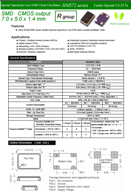 MERCURY晶振,臺產有源晶振,HM572R時鐘晶體振蕩器.貼片式石英晶體振蕩器,低電壓啟動功率,并且有多種電壓供選擇,比如有1.8V,2.5V,3.3V,3.8V,5V等,產品被廣泛應用于,平板筆記本,GPS系統(tǒng),光纖通道,千兆以太網,串行ATA,串行連接SCSI,PCI-Express的SDH / SONET發(fā)射基站等領域.符合RoHS/無鉛.