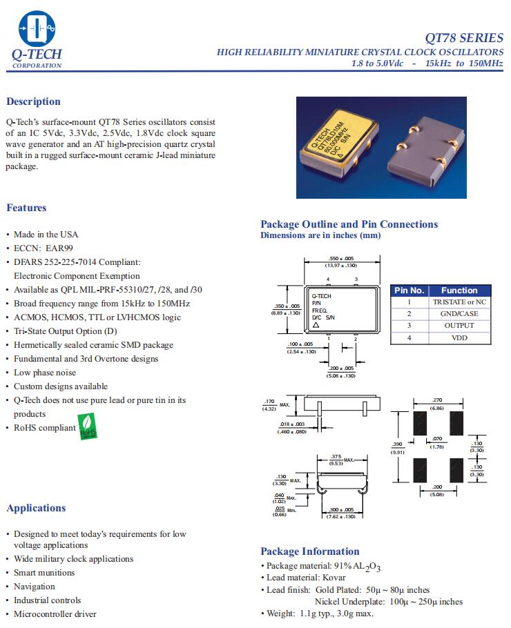 QT78HCD11M-75.000MHz|6G發(fā)射器晶振|低相位噪聲晶振, Q-Tech美國晶振,QT78有源晶振,QT78HCD11M-75.000MHz晶振,進口貼片晶振,石英晶體振蕩器,低相位噪聲晶振,頻率75MHz,工作溫度-40~85°C,電壓5V,頻率穩(wěn)定性50ppm,基頻和第三泛音設計,耐高溫晶振,無鉛環(huán)保晶振,6G發(fā)射器晶振,軍用時鐘應用晶振, 智能彈藥應用晶振,工業(yè)控制應用晶振,微控制器驅動器應用晶振.