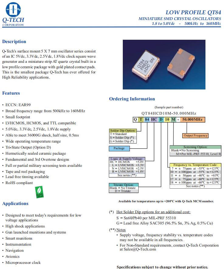 QT84HCD10M-48.000MHz,HCMOS輸出晶振,6G發射器晶振, Q-Tech晶振,QT84有源石英晶振,QT84HCD10M-48.000MHz晶振,小體積SMD晶振,HCMOS輸出晶振,石英晶體振蕩器,頻率48MHz,工作溫度-55~125°C,電壓5V,頻率穩定性100ppm,抗振動晶振,無鉛環保晶振,高沖擊應用晶振,炮射彈藥和系統晶振,智能彈藥晶振,航空電子設備晶振,GPS導航晶振.