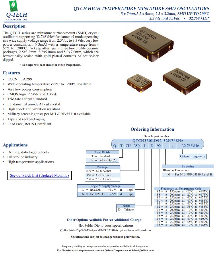 QTCH350LD92-32K768Hz,5032mm有源晶振,6G基站晶振,Q-Tech晶振,型號QTCH350,編碼QTCH350LD92-32K768Hz,是微型表面貼裝SMD晶體,支持32.768kHz*基模操作的石英晶體振蕩器,在2.5Vdc到3.3Vdc的寬電源電壓范圍內(nèi),有非常低的功耗(< 3mA),溫度范圍-55℃至+200℃,具有高抗沖擊和抗振動性,6G基站晶振,鉆井、數(shù)據(jù)記錄工具晶振,高溫應(yīng)用晶振.