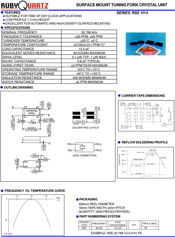 Rubyquartz晶振,RSE-H14貼片諧振器,RSE-32.768-12.5-H14-TR音叉晶體,32.768KHz時鐘晶體具有小型,薄型,輕型的貼片晶振表面音叉型晶體振蕩器,產品具有優良的耐熱性,耐環境特性,可發揮晶振優良的電氣特性,符合RoHS規定,滿足無鉛焊接的高溫回流溫度曲線要求,金屬外殼的封裝使得產品在封裝時能發揮比陶瓷振蕩器外殼更好的耐沖擊性.