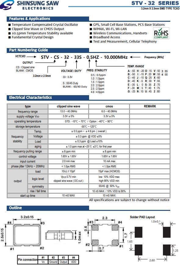 韓國新松晶振,STV-32貼片溫補晶振,STV-CS-32-33S-0.5HZ-10.000MHz有源振蕩子,小型SMD有源晶振,從最初超大體積到現(xiàn)在的7050mm,6035mm,5032mm,3225mm,2520mm體積,有著翻天覆地的改變,體積的變小也使產(chǎn)品帶來了更高的穩(wěn)定性能,接縫密封石英晶體振蕩器,精度高,覆蓋頻率范圍寬的特點,SMD高速自動安裝和高溫回流焊設(shè)計,Optionable待機輸出三態(tài)輸出功能,電源電壓范圍:1.8V~5V,高穩(wěn)定性,低抖動,低功耗,主要應(yīng)用領(lǐng)域:無線通訊,高端智能手機,平板筆記本W(wǎng)LAN,藍牙,數(shù)碼相機,DSL和其他IT產(chǎn)品的晶振應(yīng)用,三態(tài)功能,PC和LCDM等高端數(shù)碼領(lǐng)域,符合RoHS/無鉛.