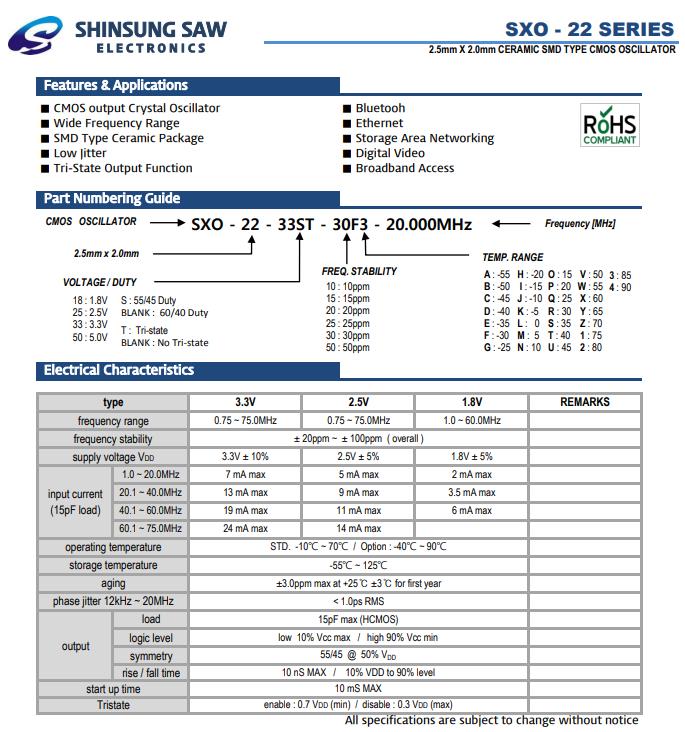 韓國(guó)新松晶振,SXO-22晶體振蕩器,SXO-22-15ST-30F3-20.000MHz晶振,有源晶振,是指晶體本身起振需要外部電壓供應(yīng),起振后可直接驅(qū)動(dòng)CMOS集成電路,產(chǎn)品本身已實(shí)現(xiàn)與薄型IC(TSSOP封裝,TVSOP封裝)同樣的1mm厚度,斷開(kāi)時(shí)的消費(fèi)電流是15µA以下,編帶包裝方式可對(duì)應(yīng)自動(dòng)搭載及IR回流焊接(無(wú)鉛對(duì)應(yīng))產(chǎn)品有幾種電壓供選1.8V,2.5V,3V3.3V,5V,以應(yīng)對(duì)不同IC產(chǎn)品需要.