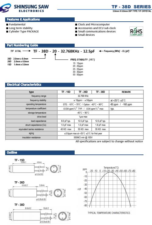 SHINSUNG晶振,TF-26D插件音叉晶體,TF-26D-15-32.768KHz-12.5pF晶振,插件石英32.768KHz晶振最適合用于比較低端的電子產品,比如兒童玩具,普通家用電器,即使在汽車電子領域中也能使產品高可靠性的使用.并且可用于安全控制裝置的CPU時鐘信號發生源部分,好比時鐘單片機上的石英晶振,在極端嚴酷的環境條件下,晶振也能正常工作,具有穩定的起振特性,高耐熱性,耐熱循環性和耐振性等.