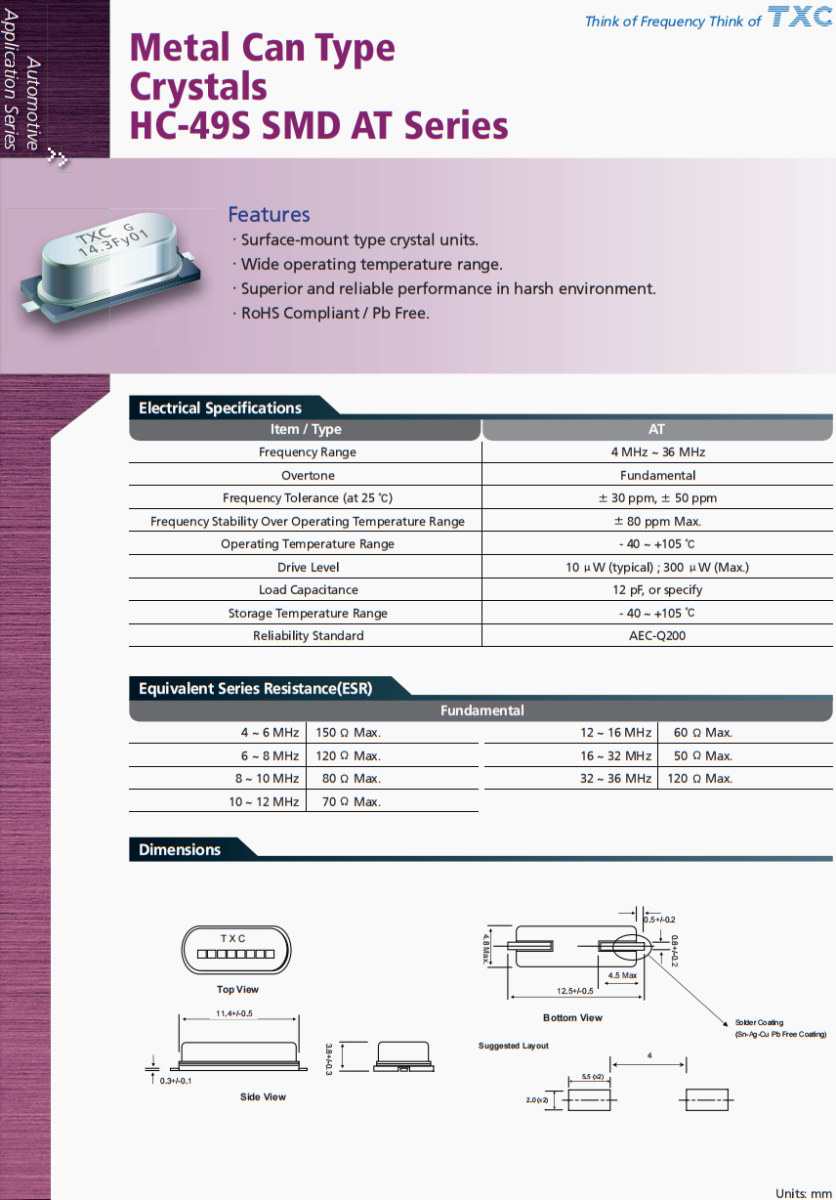 TXC晶振,AT-16.666MBGJ-T晶振,汽車(chē)空調(diào)控制面板晶振,臺(tái)灣TXC晶振公司,晶技晶振,臺(tái)灣晶振,進(jìn)口晶振,四腳晶振,AT-16.666MBGJ-T晶振,無(wú)源晶振,網(wǎng)絡(luò)設(shè)備晶振,汽車(chē)晶振,高品質(zhì)晶振,汽車(chē)氛圍燈晶振,大燈控制器晶振,小尺寸晶振,耐高溫晶振,金屬罐型,晶體, AT系列HC-49S SMD,特征,表面貼裝型晶體單元。工作溫度范圍寬。·惡劣環(huán)境下性能優(yōu)越可靠。符合RoHS標(biāo)準(zhǔn)/無(wú)鉛。