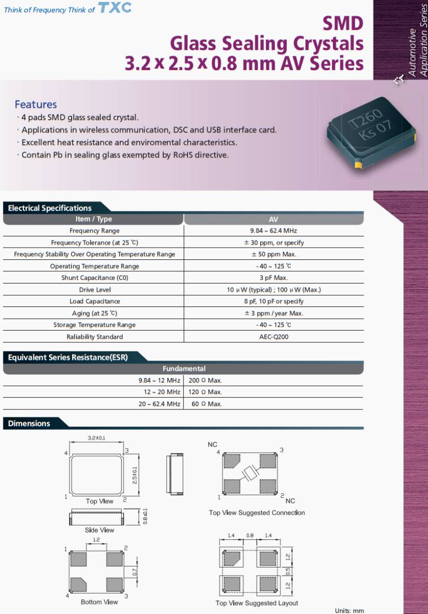 | AV-9.8433MAGV-T | TXC晶振 | AV | 9.8433MHz | ±50ppm | ±30ppm | 8pF |