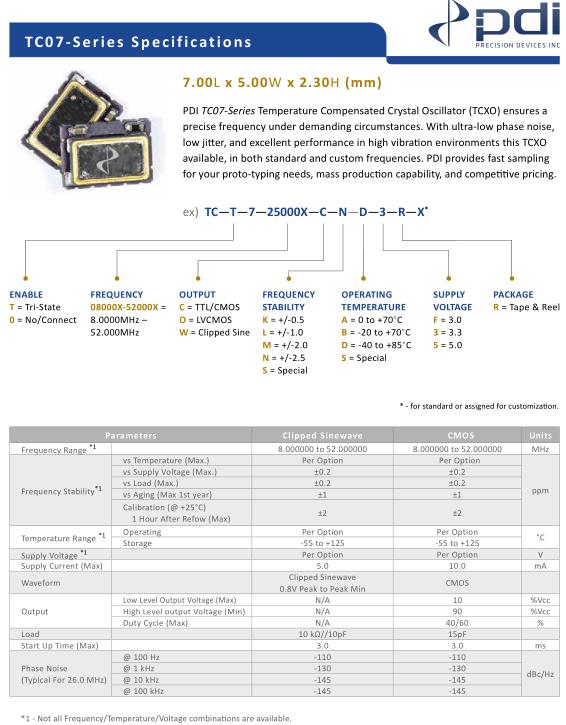 wi2wi晶體,TC07溫度補償晶體振蕩器,TCT7-24000X-CND3RX晶振,小型SMD有源晶振,從最初超大體積到現在的7050mm,6035mm,5032mm,3225mm,2520mm體積,有著翻天覆地的改變,體積的變小也使產品帶來了更高的穩定性能,接縫密封石英晶體振蕩器,精度高,覆蓋頻率范圍寬的特點,SMD高速自動安裝和高溫回流焊設計,Optionable待機輸出三態輸出功能,電源電壓范圍:1.8V~5V,高穩定性,低抖動,低功耗,主要應用領域:無線通訊,高端智能手機,平板筆記本WLAN,藍牙,數碼相機,DSL和其他IT產品的晶振應用,三態功能,PC和LCDM等高端數碼領域,符合RoHS/無鉛.