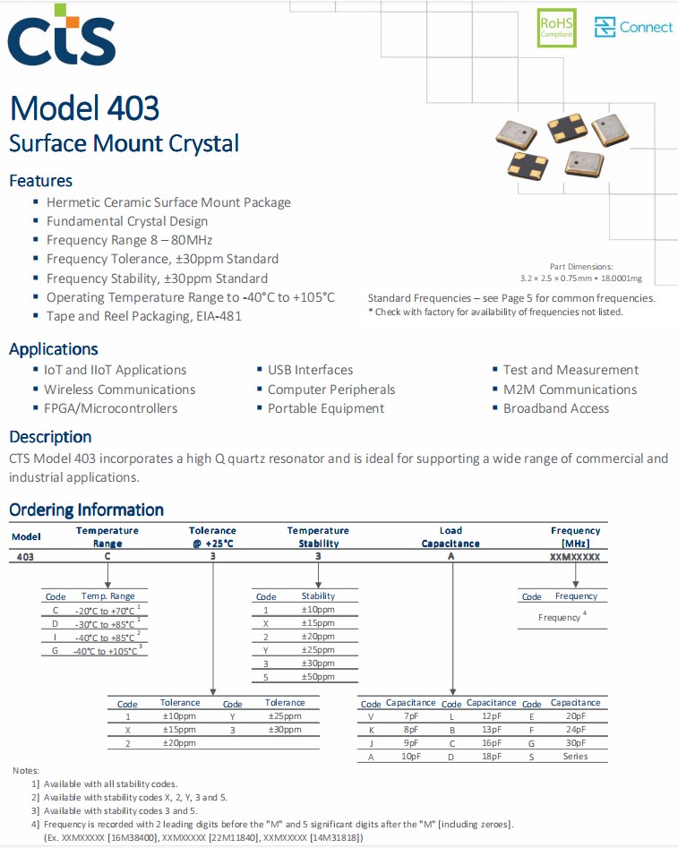 | 403I35D30M00000 | CTS Crystal | 403 | MHz Crystal | 30MHz | 4-SMD, No Lead |