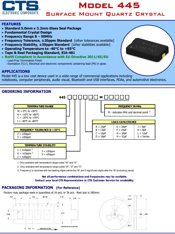 | 445A35D24M57600 | CTS晶振 | 445 | 24.576MHz | 2-SMD, No Lead |