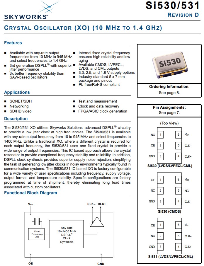 Si531 XO支持多種選項(xiàng),包括頻率、溫度穩(wěn)定性、輸出格式和VDD。 裝運(yùn)時(shí),Si531有源晶振中已編程設(shè)定了具體的器件配置。配置可以是 使用下面的零件號(hào)配置表指定。Skyworks解決方案提供了一個(gè)基于網(wǎng)絡(luò)瀏覽器的零件號(hào)配置實(shí)用程序來簡化此過程。Si531 XO系列采用符合RoHS標(biāo)準(zhǔn)的工業(yè)標(biāo)準(zhǔn)6- 襯墊,小體積7.0x5.0mm包裝。Si531系列支持LVPECL、LVDS和的備用OE引腳排列(引腳#1) CML輸出格式。531AC156M250DG應(yīng)用于時(shí)鐘和數(shù)據(jù)恢復(fù)晶振