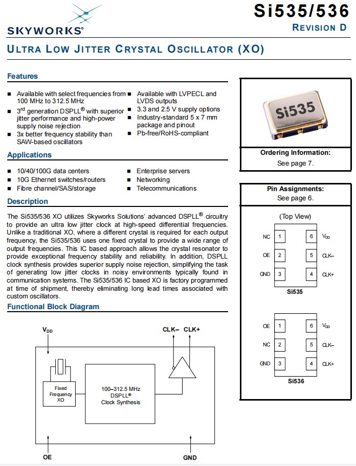 XO晶體振蕩器536EB156M250DG提供一個高速差分頻率的超低抖動時鐘,Silicon晶振Si535/536 XO支持多種選項,包括頻率、溫度穩(wěn)定性、輸出格式和VDD。貼片石英晶振Si535和Si536 XO系列采用工業(yè)標(biāo)準(zhǔn),RoHS兼容,6墊腳,5x7mm封裝。Si536系列支持一個用于LVPECL和LVDS輸出格式的替代OE針腳(針腳#1)。