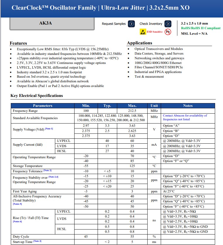 Abracon晶振AK3A是一款超低抖動石英晶體振蕩器,旨在為數據中心、100G/400G/800G以太網和光模塊等高速應用提供穩定、精確的時鐘信號。該器件使用第三泛音技術來實現64fs抖動性能和更低的功耗。作為我們的延伸ClearClock系列,非常適合需要100至212.5MHz載波頻率和400Gbps通道速率的應用。AK3A有源石英晶振是緊湊型設計的完美解決方案,因為它支持3.2x2.5mm的行業標準尺寸,但與AK2和AX3系列相比,抖動性能大幅提高。這些系列的振蕩器可在Abracon的全球分銷網絡中獲得,并提供各種輸出邏輯,如LVPECL、LVDS和HCSL。這些器件在提供可靠、高效振蕩的同時,可以在-40°C至+85°C的工作溫度范圍內保持25ppm的穩定性,在-20°C至+70°C的工作溫度范圍內保持15ppm的穩定性。光學收發器和光模塊應用晶振AK3APAF1-156.2500T3