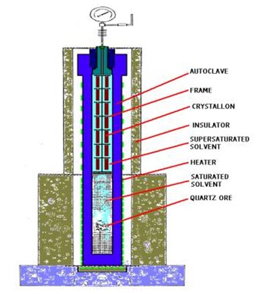 高品質的天然石英晶體數量有限,而且價格很高,這就促使了合成石英制造業(yè)的發(fā)展。合成石英晶體在垂直的高壓釜里生產,高壓釜以水熱法的原理工作,溫度大約為400℃,壓力為1000個大氣壓左右。籽晶放在高壓釜上部,天然石英原料被放在下部。升溫加壓的時候,高壓釜內的溶液呈堿性。高壓釜的加熱裝置,在容器內部制造出上部比下部溫度低的環(huán)境。這個溫度梯度造成溶解了底部天然石英的堿性溶液的對流,而且使天然石英沉積在頂部的籽晶片上。就是用這種方法生產,它可以在幾星期內長好幾百克。如果在溫度達到573℃的時候,α石英將相變成β石英(失去壓電特性)。