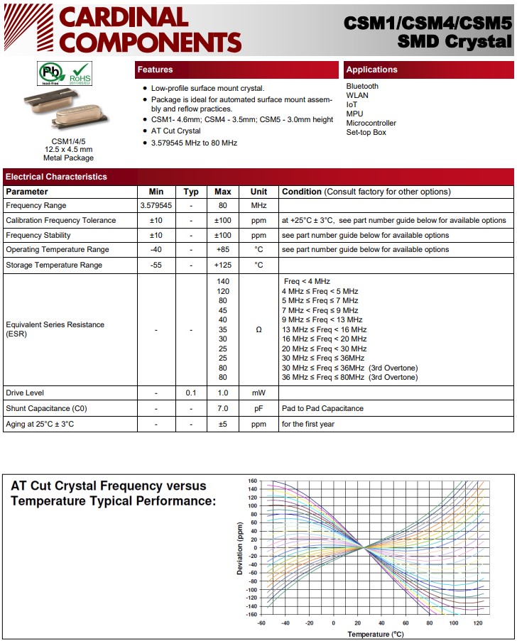美國Cardinal卡迪納爾晶振CSM系列,晶振CSM1:13x4.7x4.6毫米,CSM4:13x4.7x3.5毫米,CSM5:13x4.7x3.0毫米,SMD晶體,兩腳貼片晶振,無源晶振,石英貼片晶振,石英晶體諧振器,無鉛環(huán)保晶振,薄型表面貼裝水晶,封裝是自動化表面安裝組裝和回流實踐的理想選擇,CSM1-4.6毫米;CSM4-3.5毫米;CSM5-3.0mm高,AT切割水晶,頻率范圍:3.579545MHz至80MHz。工作溫度范圍:-40℃至+85℃,該無源晶振應(yīng)用于:藍(lán)牙,無線局域網(wǎng),物聯(lián)網(wǎng),最大功率放大器,微控制器,機(jī)頂盒。石英晶體CSM1Z-A5B2C5-60-24.0D18適用于無線局域網(wǎng)應(yīng)用