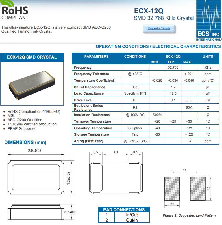 | ECS-.327-12.5-34QCS-TR | ECS晶振 | ECX-34Q | kHz Crystal (Tuning Fork) | 32.768kHz | -40°C ~ 125°C |
