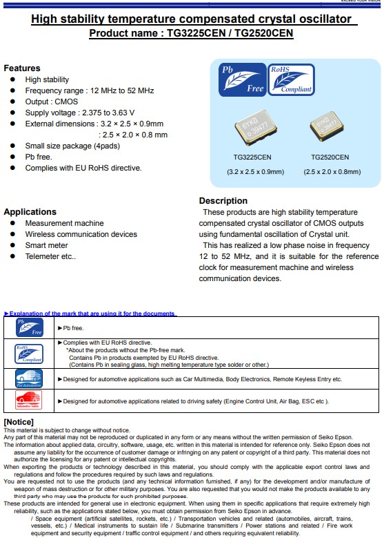 日本愛普生晶振TG2520CEN,是一款TCXO溫補(bǔ)晶振,小體積晶振尺寸2.5x2.0mm有源晶振,四腳貼片晶振,石英晶體振蕩器,電源電壓2.375V至3.63V,具有高穩(wěn)定溫度CMOS輸出的補(bǔ)償晶體振蕩器,超小型,輕薄型,低抖動(dòng),低功耗,低損耗,低耗能,低電源電壓,高穩(wěn)定性等特點(diǎn),利用晶體單元的基本振蕩。這實(shí)現(xiàn)了頻率中的低相位噪聲12MHz至52MHz,適合用作基準(zhǔn)電壓源,無(wú)線通信設(shè)備,智能電表,遙測(cè)儀,測(cè)量機(jī)器和無(wú)線的時(shí)鐘通訊設(shè)備。