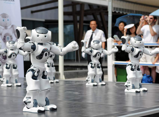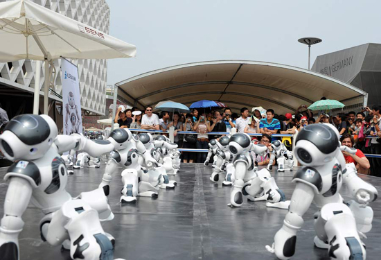 上海世博會(huì)迎來法國(guó)館國(guó)家館日活動(dòng)。在法國(guó)館外,20個(gè)憨態(tài)可掬的機(jī)器人“腦”和著音樂的節(jié)拍,為觀眾帶來精彩的集體舞表演,吸引了眾多觀眾觀看。據(jù)介紹,身高58厘米的機(jī)器人“腦”,跳舞、爵士樂、足球樣樣精通,還通曉20多個(gè)國(guó)家的語言,被一些觀眾稱為“小天才”。