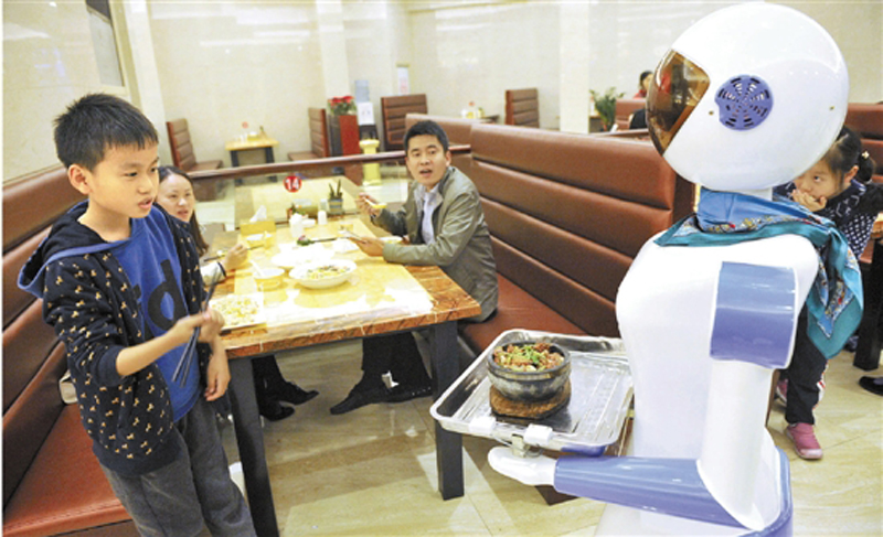 這是一家餐廳剛剛開業(yè),里面有5個(gè)機(jī)器人:兩個(gè)送餐,并且能報(bào)出各種菜名,三個(gè)小機(jī)器人在門口跳舞助興。機(jī)器人送餐、跳舞助興,這些以往只能在科幻電影中看到的場(chǎng)面,在寧波慈溪的一家餐廳成為現(xiàn)實(shí)。據(jù)老板利用機(jī)器人送餐,相比雇人,光兩個(gè)送菜機(jī)器人一年能省20多萬元。