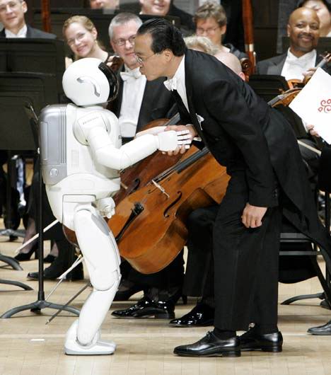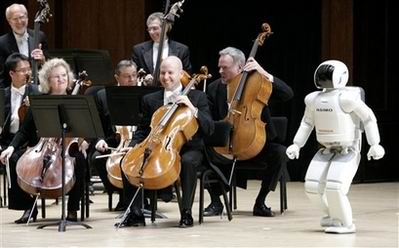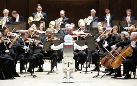 機(jī)器人現(xiàn)場(chǎng)指揮交響樂 點(diǎn)頭鞠躬無所不能,在一片暗淡光線的籠罩下,坐無缺席的音樂大廳逐漸安靜下來,指揮家像模像樣地走了出來,站在觀眾面前的是一個(gè)全身閃著亮光的白顏色機(jī)器人,高4英尺三英寸。這個(gè)非同尋常的機(jī)器人名為ASIMO,它于本周二晚接受了一次嚴(yán)峻挑戰(zhàn):現(xiàn)場(chǎng)指揮底特律交響樂團(tuán),樂團(tuán)演奏的是百老匯音樂劇《夢(mèng)幻騎士》中的精彩曲目《不可能的夢(mèng)想》。ASIMO以小孩子的口吻對(duì)觀眾說:“大家好”,隨后向樂隊(duì)擺手,示意演出開始。