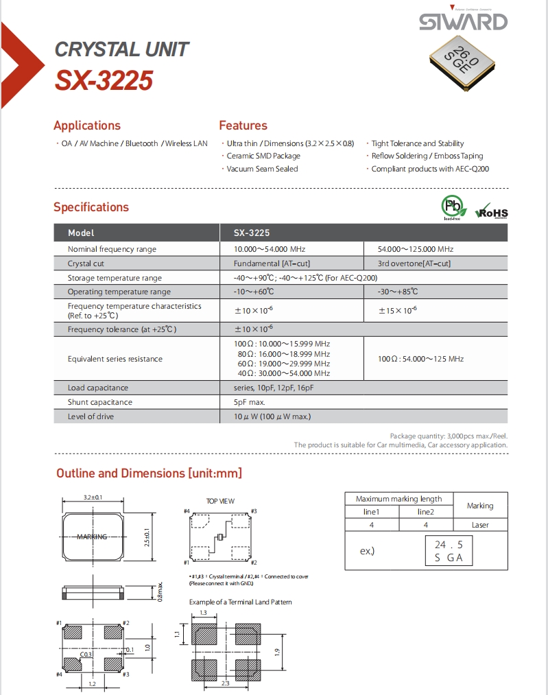 | XTL571100-N98-008 | Siward晶振 | SX-3225 | 25 MHz | ±10ppm | 20pF | -20 ℃~75 ℃ |